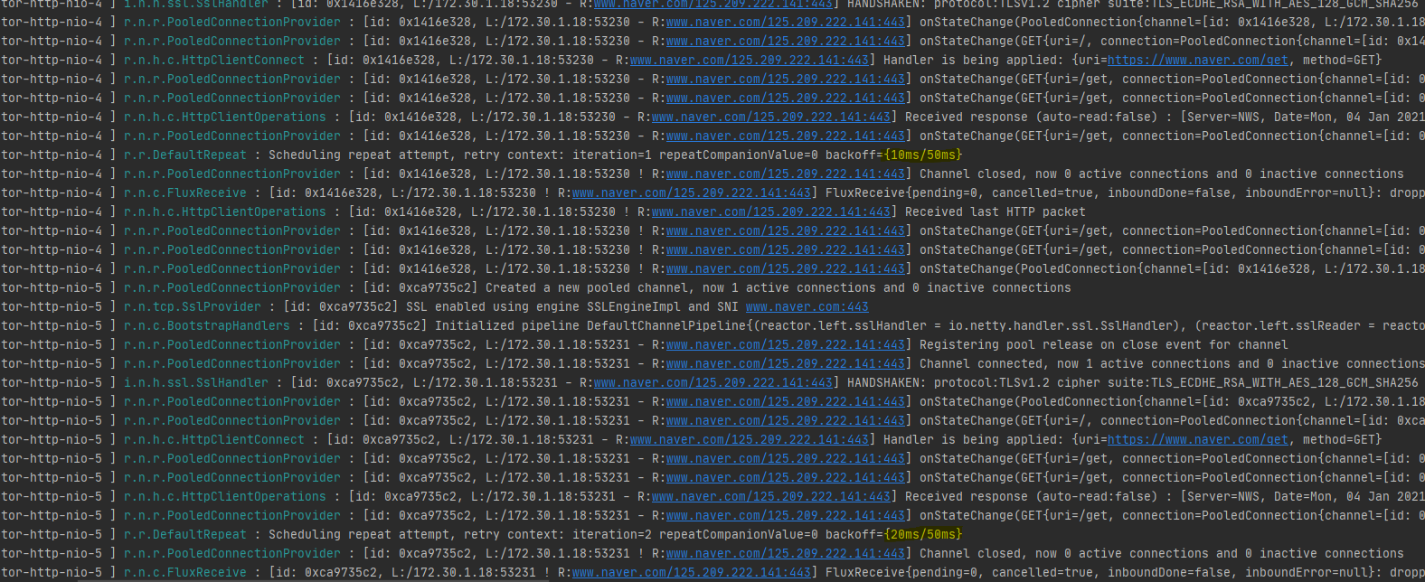 - log를 보면 아래와 같이 재시도 하는 모습을 볼 수 있다. 404 not found도 재시도 하도록 해 놔서 아래와 같이 테스트가 가능하다.