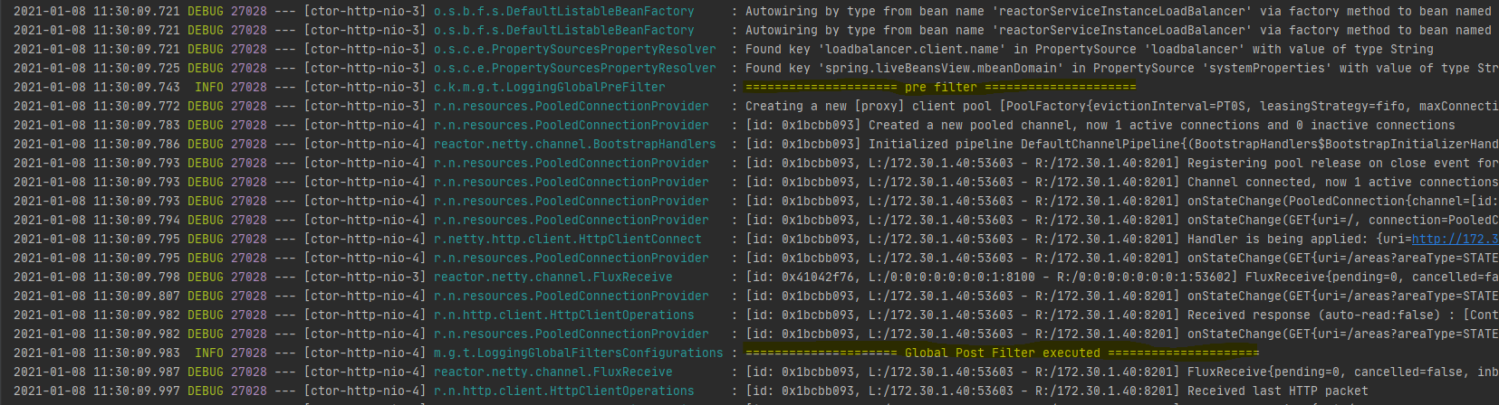 2021-01-08 12:33:28.122 INFO 29652 --- [ctor-http-nio-3] c.k.m.g.t.LoggingGlobalPreFilter : ===================== post filter =====================