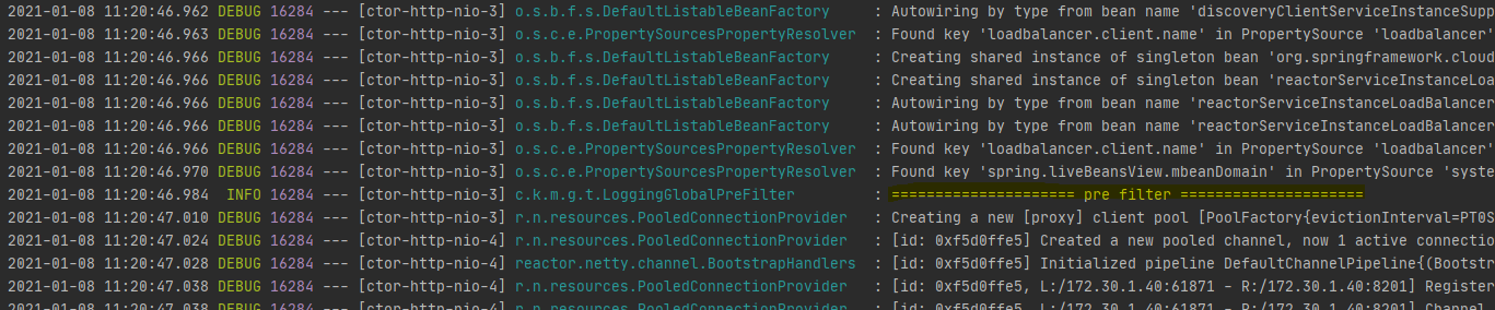 2021-01-08 12:33:27.640 INFO 29652 --- [ctor-http-nio-3] c.k.m.g.t.LoggingGlobalPreFilter : ===================== pre filter =====================