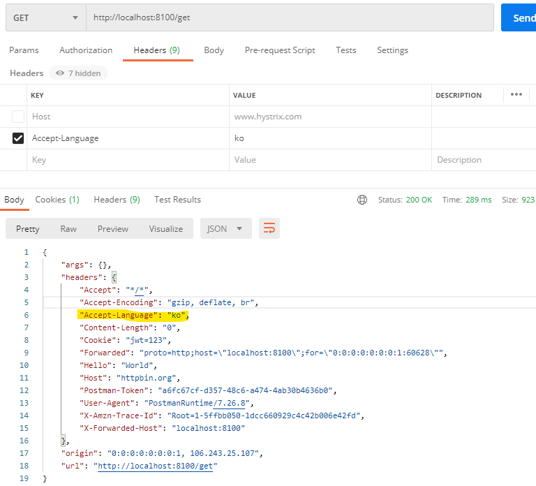 반면 Accept-Language를 빼고 호출하게 되면 다음과 같이 결과가 나온다. 기본 값으로 설정한 java.util.Locale의 Locale.KOREA 값인 ko-kr로 변경된다.