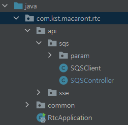 원래 구조는 com.kst.macaront.rtc 아래 바로 sqs 패키지가 존재하였다가 api 밑으로 옮겨 온 것이였는데 왠지 의심이 가기 시작.