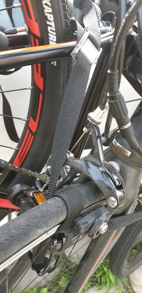 그리고 주행 중 핸들이 돌아가 차량에 스크래치를 내는 것을 방지하기 위하여 긴 끈으로 아래와 같이 묶어 사용하였다.
