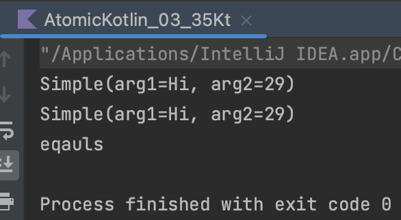 그리고 기본적으로 두 개의 인스턴스가 동일한지를 확인해 주는 equals라는 멤버 함수를 자동으로 만들어 주며, 생서자 파라미터에 포함된 모든 프로퍼티가 같은지 검사하는 식으로 동작한다.