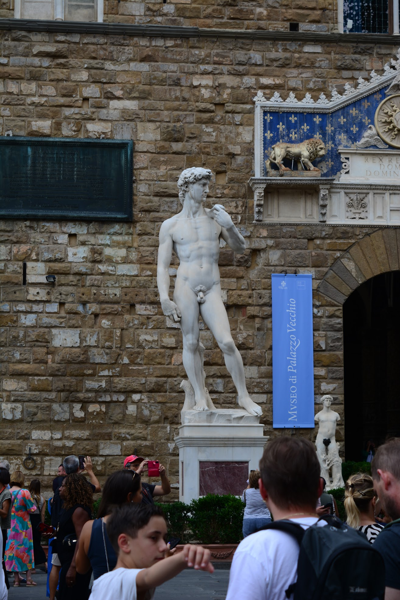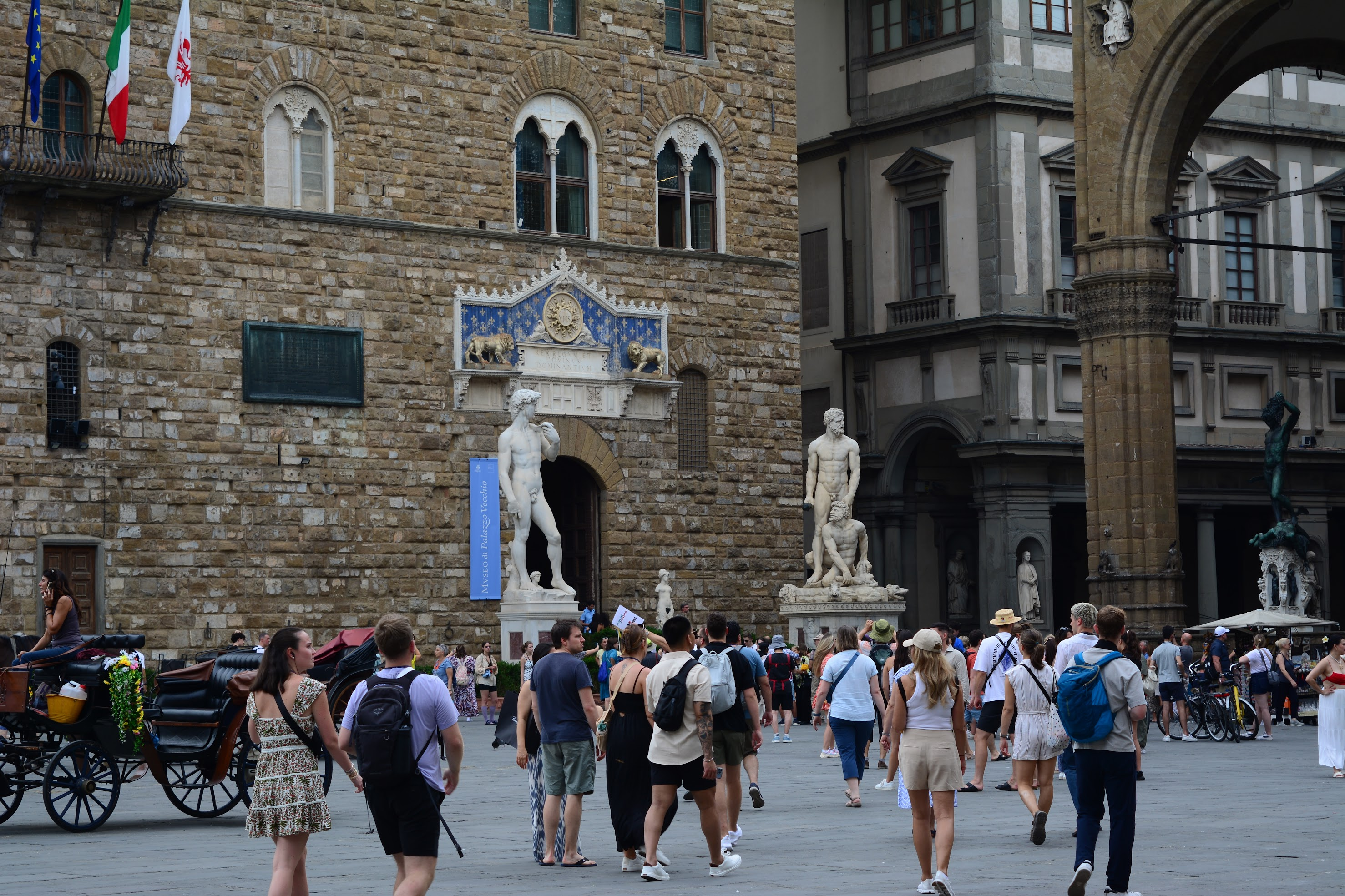 시뇨리아 광장의 저 건물 앞에는 유명한 모습의 석상이 눈에 띕니다.